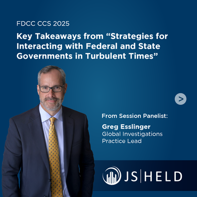 From foreign investment scrutiny to trade fraud enforcement, shifting federal and state priorities are reshaping corporate compliance. At the Federation of Defense & Corporate Counsel (FDCC) 2025 Corporate Counsel Symposium (CCS) in Chicago, J.S. Held compliance, risk, and investigations expert Greg Esslinger joined a panel to discuss 'Strategies for Interacting with Federal and State Governments in Turbulent Times,' focusing on the current climate for mergers, acquisitions, and corporate compliance. Below, he shares key takeaways from the session designed to help businesses refine their M&A techniques, navigate high-stakes transactions and investigations, and realize value amid global government shifts. REGULATORY EXPECTATIONS ARE SHIFTING QUICKLY Government agencies are adjusting their enforcement priorities, with increased scrutiny on foreign investments, beneficial ownership, and emerging areas like healthcare fraud, sanctions and tariffs, and foreign terrorist organizations (FTOs). M&A REQUIRES STRATEGIC RISK MANAGEMENT In today’s volatile regulatory climate, mergers, acquisitions, and joint ventures demand enhanced due diligence. Tariffs, supply chain disruptions, and national security concerns are reshaping how companies value and structure deals. MULTI-JURISDICTIONAL OVERSIGHT IS INCREASING State and international enforcement and regulatory agencies are ramping up efforts, bringing heightened attention to data privacy, private litigation, whistleblower actions, and cross-border investigations, which carry potential reputational and financial risk. INVESTIGATIONS DEMAND AGILITY AND FORESIGHT As enforcement priorities shift across areas like customs, healthcare, and workplace equity initiatives, companies face growing exposure to government inquiries. Preparation and adaptability are key to mitigating risk. For more information about J.S. Held's investigations and compliance consulting expertise: To explore the topic further, simply connect with Greg through his icon below.