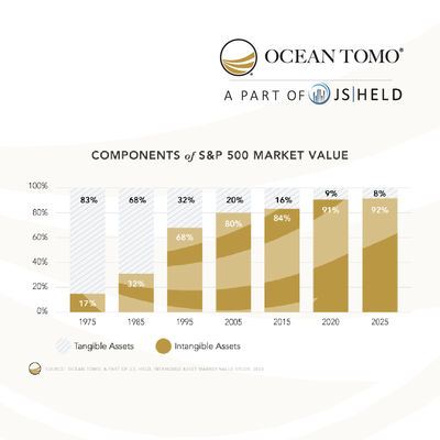 Global consulting firm J.S. Held announces the release of the Ocean Tomo Intangible Asset Market Value (IAMV) study. With this release, the study now reflects a panel of 50 years of data in the US market and 20 years of data in foreign markets. The study examines the components of market value, specifically the role of intangible assets, across a range of global indexes. IAMV is shown as of calendar year end by subtracting net tangible asset value from market capitalization. Commenting on the Components of S&P 500® Market Value, economic expert and study author Matthew Johnson observes, “the composition of corporate value has undergone a fundamental transformation over the past five decades.” In 1975, tangible assets—property, plant, equipment, inventory, and other physical capital—represented 83% of the market value of companies comprising the S&P 500 index, with intangible assets accounting for only 17%. By the end of 2025, this relationship had completely inverted: intangible assets now constitute approximately 92% of S&P 500 market capitalization, while tangible assets have been reduced to a mere 8%. Johnson adds, “This 75 percentage point shift represents what Ocean Tomo has defined as ‘economic inversion’— a wholesale transformation in the nature of value creation whereby economic worth has migrated from what can be ‘touched’ to what can be ‘thought’." The magnitude and implications of this transformation are comparable to the Industrial Revolution of the 18th and 19th centuries. Just as the Industrial Revolution fundamentally restructured economic activity from agrarian and craft-based production to mechanized manufacturing, the intangible revolution has redefined the sources and measurement of corporate value in the 21st century. Ocean Tomo Co-founder and J.S. Held Chief Intellectual Property Officer, James E. Malackowski observes, “While the Industrial Revolution required a century to unfold fully, the intangible revolution has occurred within a single human lifespan, with particularly rapid acceleration occurring in the 1985-2005 period when intangible asset market value increased from 32% to 79%—a remarkable 47 percentage point surge in just two decades.” The 2020-2025 period deserves special attention: S&P 500 IAMV remained stable at approximately 90% despite the Federal Reserve implementing the most aggressive monetary tightening cycle in four decades. Dr. Nikki Tavasoli, PhD, shares, “Traditional financial theory predicts that intangible-intensive firms should be highly sensitive to interest rate changes due to their long-duration cash flows and limited collateral value.” She adds, “The observed stability challenges this prediction and requires explanation, which we address in a forthcoming paper.” In 2005, the IAMV study was expanded beyond the S&P 500 to explore the components of value in several key international markets. Stock market indexes from Europe, China, Japan, and South Korea were selected and analyzed to determine the comparable role of intangible assets. To learn more about the 2025 Intangible Asset Market Value Study, please visit: Media Contact Kristi L. Stathis, J.S. Held 1 786 833 4864 Kristi.Stathis@JSHeld.com JSHeld.com