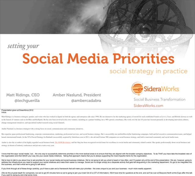 What is "social business", and how is it different than social media? What are the characteristics of a social business, and what challenges can we expect because of the implications of the social web? This talk provides an overview of the Center of Gravity, a model for tackling social business realistically and without the hype.