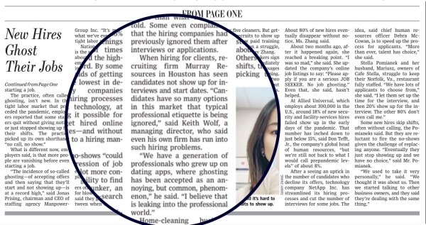 "I remember this one really well. We had placed a candidate in a sales role. The client told us that on his first day, they walked by and saw the guy sitting at his desk with his feet propped up, reading a newspaper. On his first day."